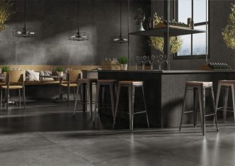 Porcelain tile: Resine Series 12″ x 24″, available in 3 colors – Grigio, Nero, and Tortora. Made in Italy.