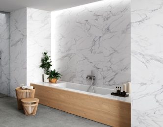 Porcelain tile: Prexious White Fantasy, available in 2 sizes – 12″ x 24″ tile and 47″ x 94″ panel. Made in Italy.