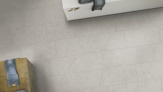 Porcelain tile: Elemental Stone 12″ x 24″, available in 3 colors – Cream, Grey, and White. Made in Italy.