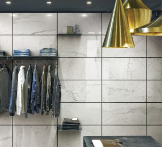 Porcelain tile: Neopolis 12″ x 24″, available in 2 colors – Bianco and Gray Made in USA