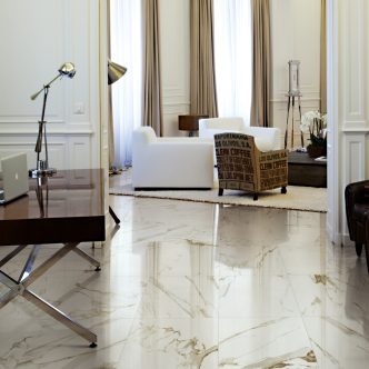 Porcelain tile: Marmorea Series 12″ x 12″, available in 4 colors – Carrara, Estatuario, Hermes, and Marquina. Made in Spain.