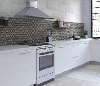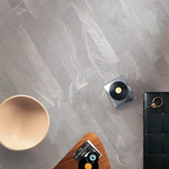 Porcelain tile: Stonehenge Series 12″ x 24″, available in 2 colors – Grey and White. Made in Spain.