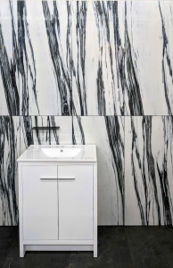 B & W Marble Porcelain tile: B & W Fall 24″ x 48″, available in polished and matte finishes. Made in Italy.