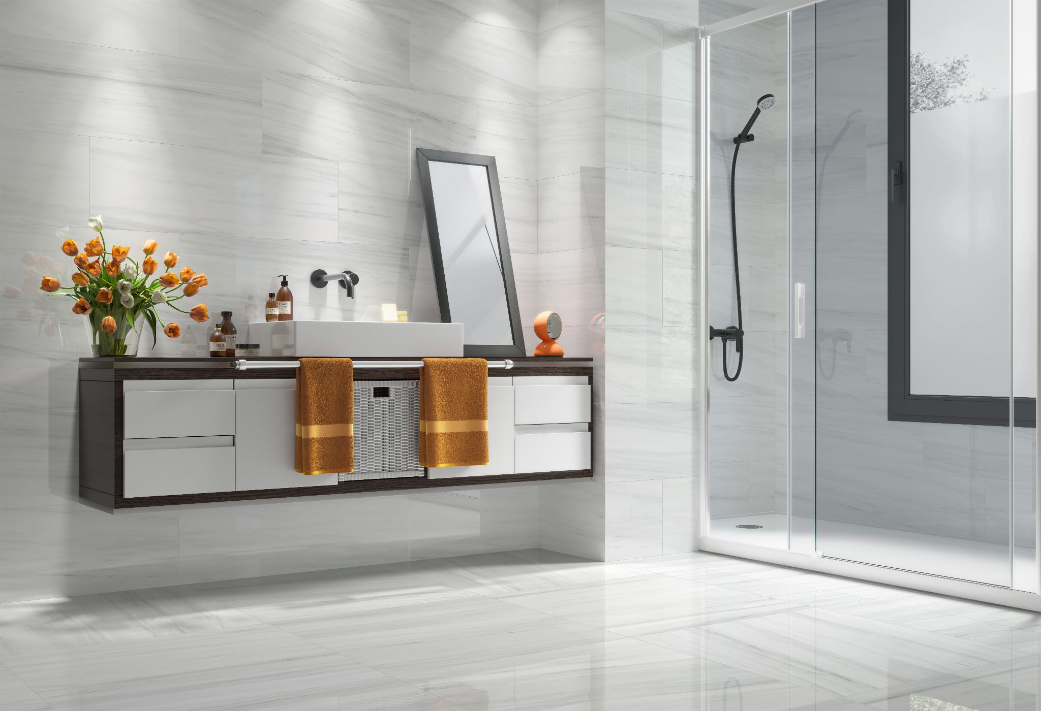 This Spanish 18″ x 36″ porcelain tile has a matte texture and is available in 2 colors: Dolomite Pearl and F D Londra Grey.